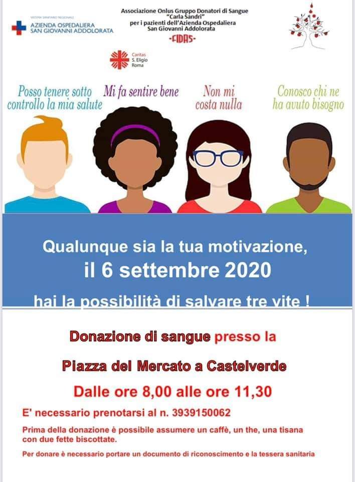 L’occasione per farlo è la giornata dedicata alla Donazione del sangue che si terrà domenica 6 settembre 2020 a Castelverde, presso la piazza del mercato.