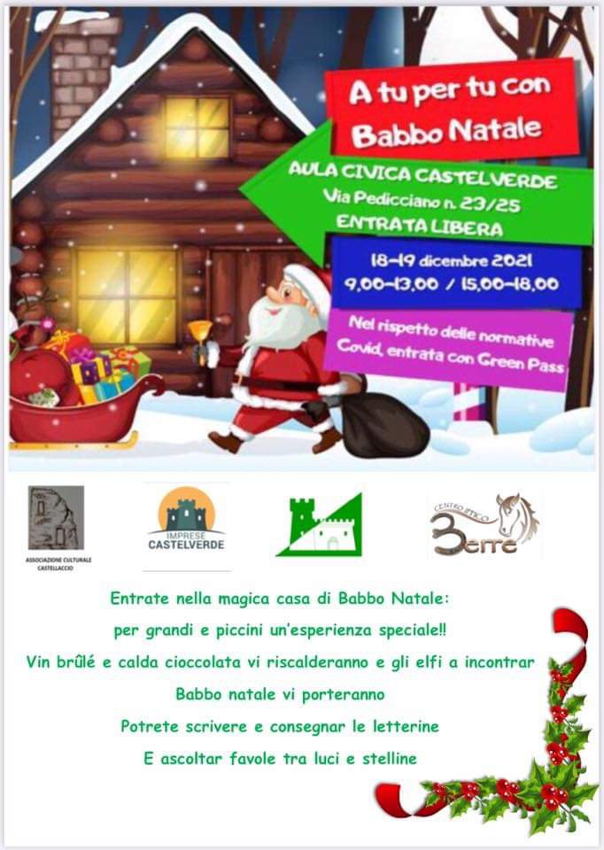 Venite a trovare Babbo Natale nella sua meravigliosa Casa! Vi aspettiamo con cioccolata calda, vin brulè e tanta magia all’Aula Civica di via Pedicciano a Castelverde!