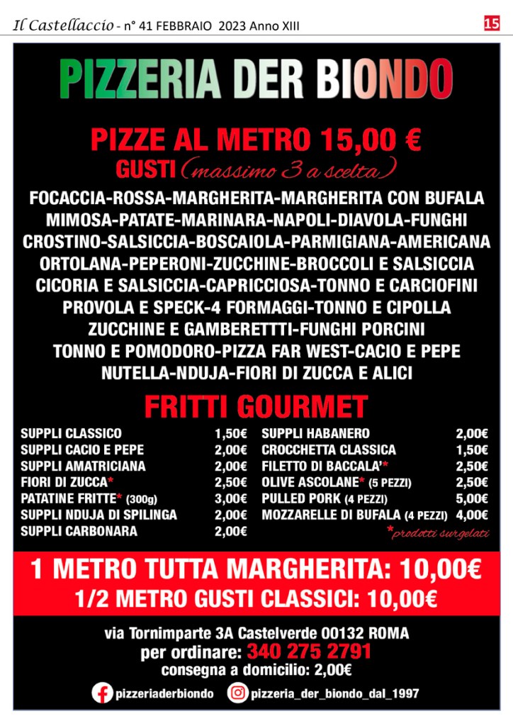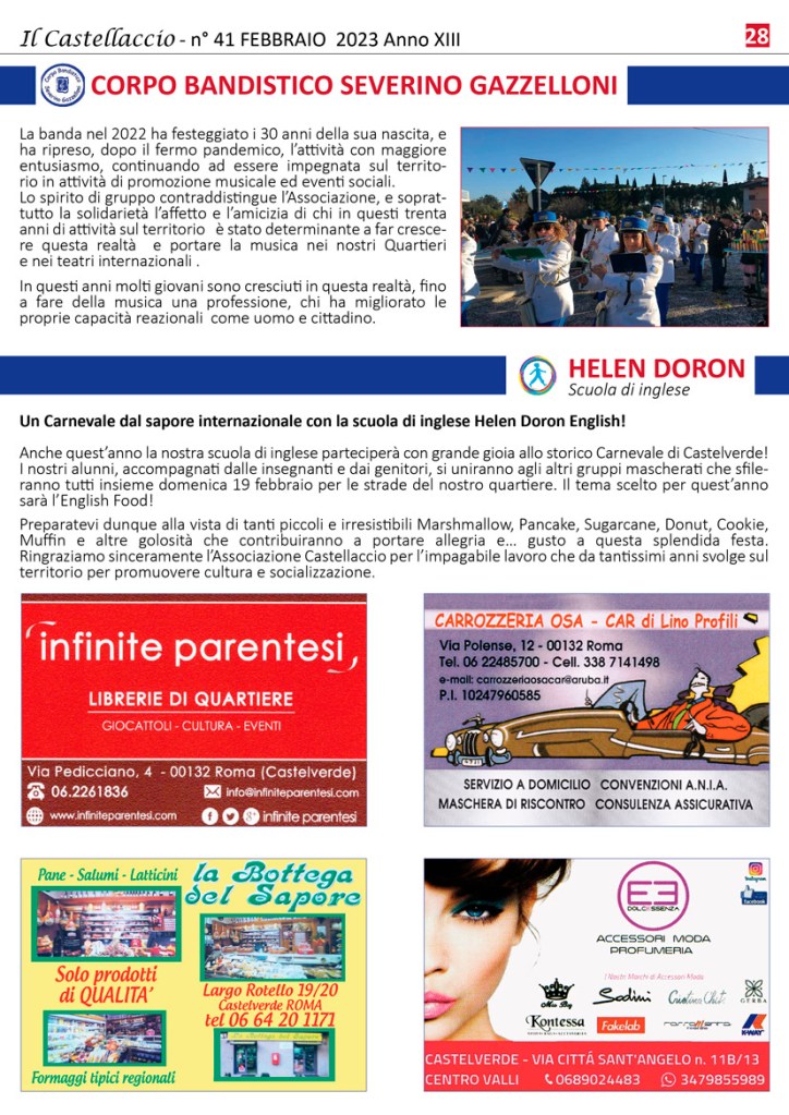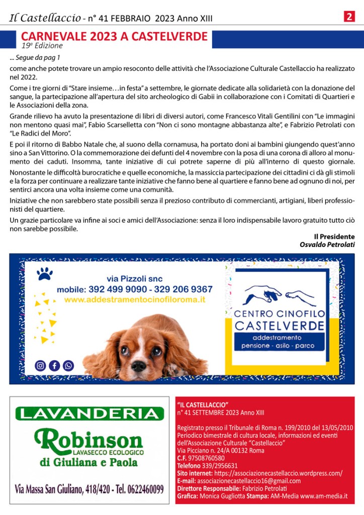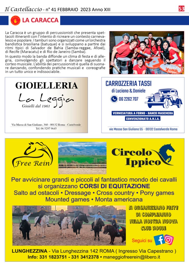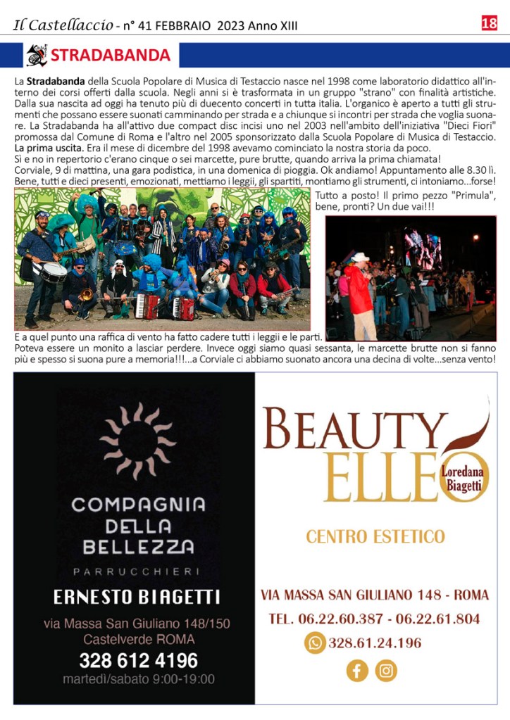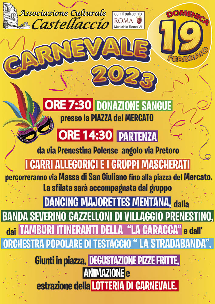 La storica manifestazione organizzata dall’Associazione Culturale Castellaccio si terrà domenica 19 febbraio 2023 e vedrà in scena carri allegorici e gruppi mascherati, accompagnati dai Tamburi itineranti della Caracca, dalla Banda Severino Gazzelloni di Villaggio Prenestino, dalle Dancing Majorettes di Mentata e dall’orchestra popolare di Testaccio “La Stradabanda”.