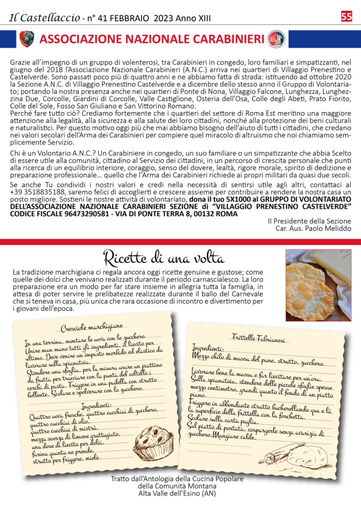 Appuntamento alle ore 14.30 in via Prenestina Polense angolo via Pretoro per la partenza della sfilata, che si snoderà lungo via Massa di San Giuliano per poi concludersi in piazza, tra balli, animazione, degustazione di pizze fritte e l’estrazione della ricca Lotteria di Carnevale.