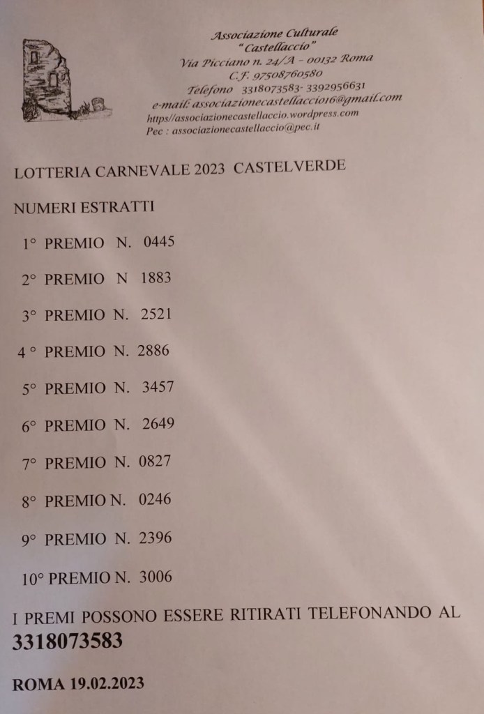 20 February 2023 associazionecastellaccio I NUMERI VINCENTI DELLA LOTTERIA DI CARNEVALE Condividi: Share on X (Opens in new window) X Share on Facebook (Opens in new window) Facebook Like Loading... Related