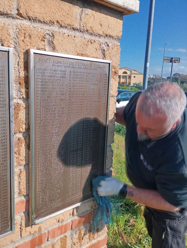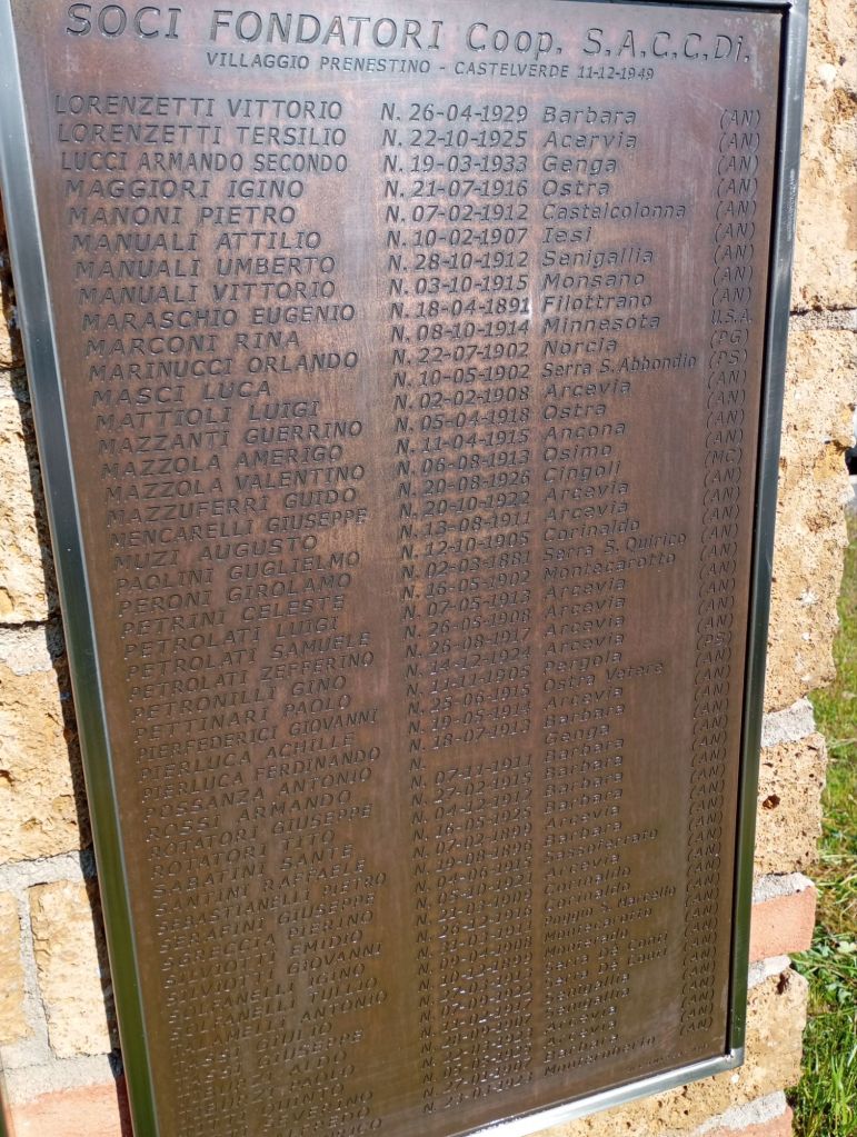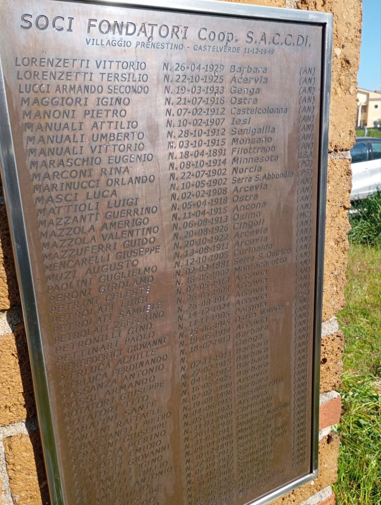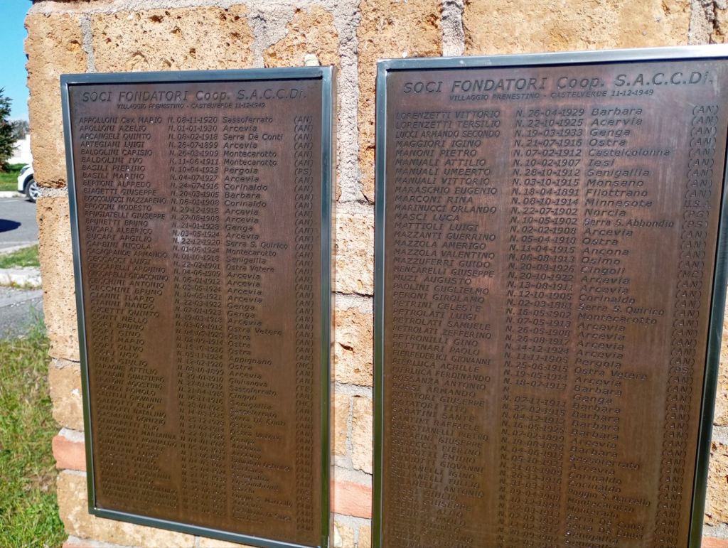 La targa sottostante, che riporta nome, cognome, luogo e data di nascita dei Soci della Cooperativa S.A.C.C.Di. (Società Anonima Cooperativa Coltivatori Diretti, società nella quale si riunirono i fondatori), fu inaugurata nel 2018 (questo il link all’articolo sull’inaugurazione: https://associazionecastellaccio.com/2018/07/11/la-memoria-e-lorgoglio-svelate-le-targhe-dei-fondatori-di-castelverde-e-villaggio-prenestino/), ed era molto annerita tanto che era diventato difficile leggere i nomi che vi erano incisi.
