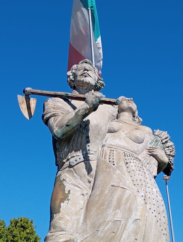 La statua, realizzata dallo scultore Fabio Crisarà, raffigura un contadino e una contadina rivolti fiduciosi verso il futuro, omaggio ai pionieri che nel 1950 – affrontando fatica, sacrifici, col sudore della fronte – fondarono le comunità di Ovile e Castellaccio, oggi Villaggio Prenestino e Castelverde. La statua è orientata proprio verso l’Ovile, il capannone che è stato per anni la prima precaria casa di decine di famiglie degli ex mezzadri provenienti prevalentemente dalle Marche.